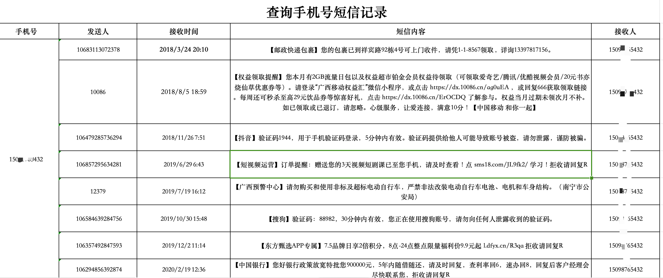提供对方手机号码,即可查询对应的发送人手机号,接收时间,短信内容,接收人手机号